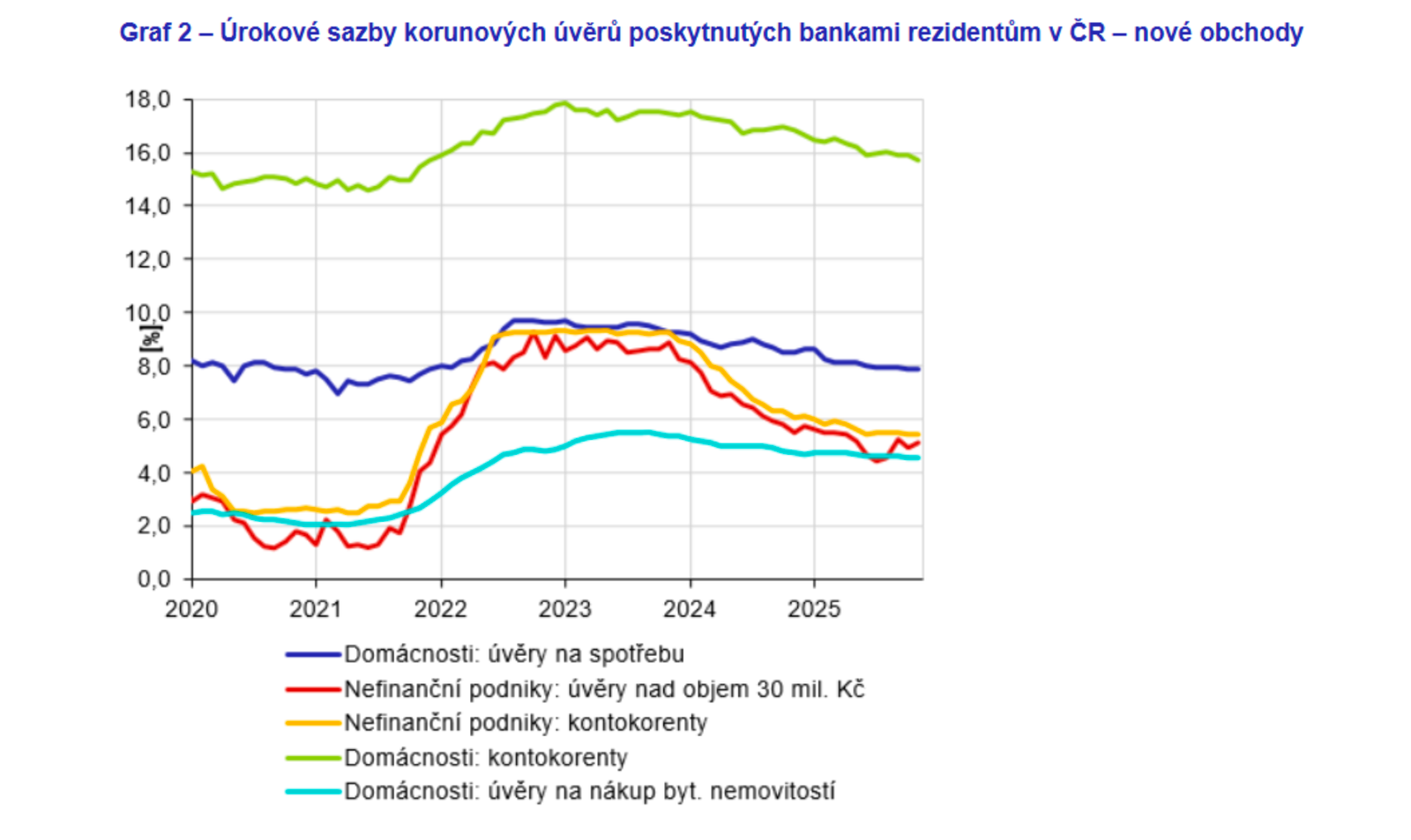 Vývoj průměrných sazeb korunových úvěrů 2020–2025 (ČR):